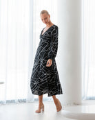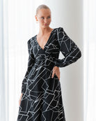 Elevate your evening ensemble with this stunning black and white dress, designed to captivate attention and accentuate your figure. The wrap bodice of this dress is expertly crafted to shape and insinuate the top half, creating a flattering silhouette that exudes elegance and sophistication.